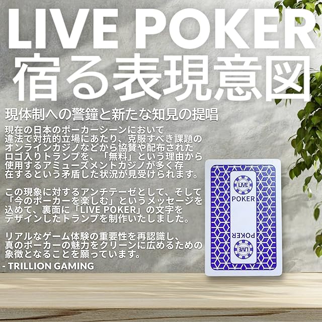 ・数多のハンド数増加ギミックを搭載 ・4色スートでスムーズな役判定、プレイングのスピードアップ ・ジャンボインデックスで明快なコミュニティカード ・シャッフル、ピッチングのし易さを追い求めたエンボス加工 ・頑丈なプラスチックで防水はもちろん防汚加工 ・全てのテーブルにマッチする7色展開 ・自動シャッフラーにも対応可能 ・カットカード付き ・業界を覆しかねない圧巻のコストパフォーマンス