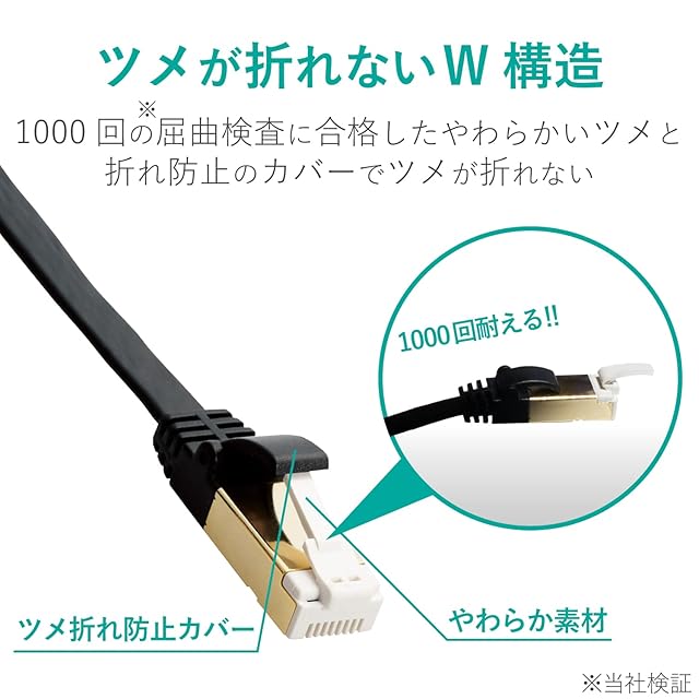 ツメ折れ防止プロテクタと屈曲に対する耐久性が高い素材コネクタを採用したダブル構造で、通常の使用環境では絶対にツメが折れないLANケーブルです。※1000回の屈曲検査に合格(当社検証)