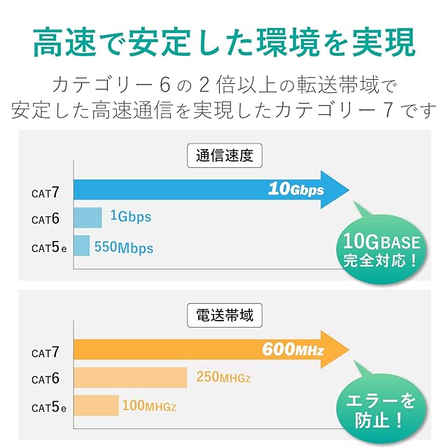 ISO/IEC 11801 ClassFに準拠しています。※ClassF(Cat7)準拠はケーブル部分のみです。本製品のプラグはRJ-45を採用しています。