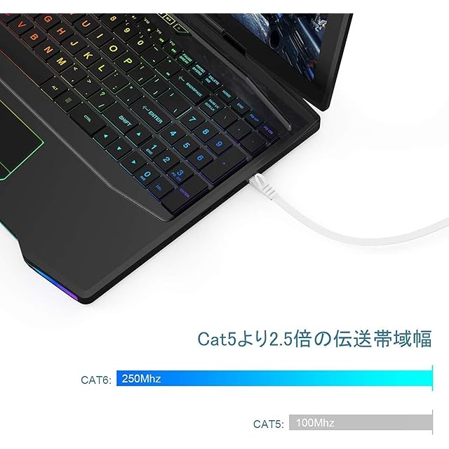 [CAT5より2.5倍の通信速度]:CAT6 LANケーブルはCAT5よりもっと高い帯域幅を持って、CAT5の2.5倍、250MHz伝送帯域幅に達します。高い帯域幅を持って、伝送速度は1000Mbps(1Gbps)、通信速度は速くなり、データを高速伝送します。1.0Gbps/250MHzの標準に達っします。10GBASE-T、100BASE-T、1000BASE-TX、100BASE-TX、10BASE-Tに適用します。10Gbpsギガビットのイーサネット環境に対応します。