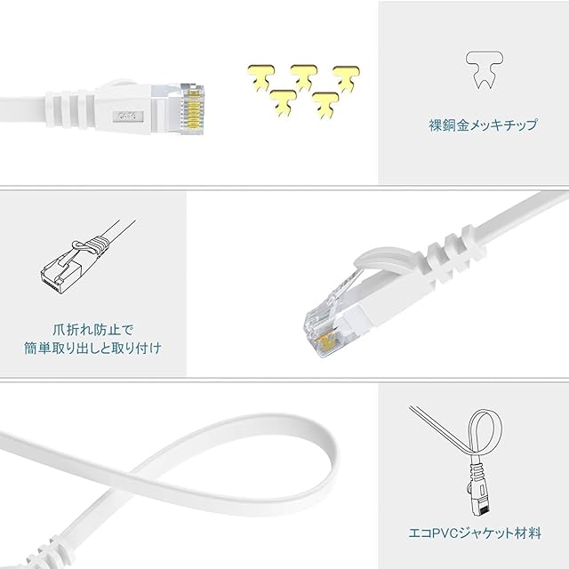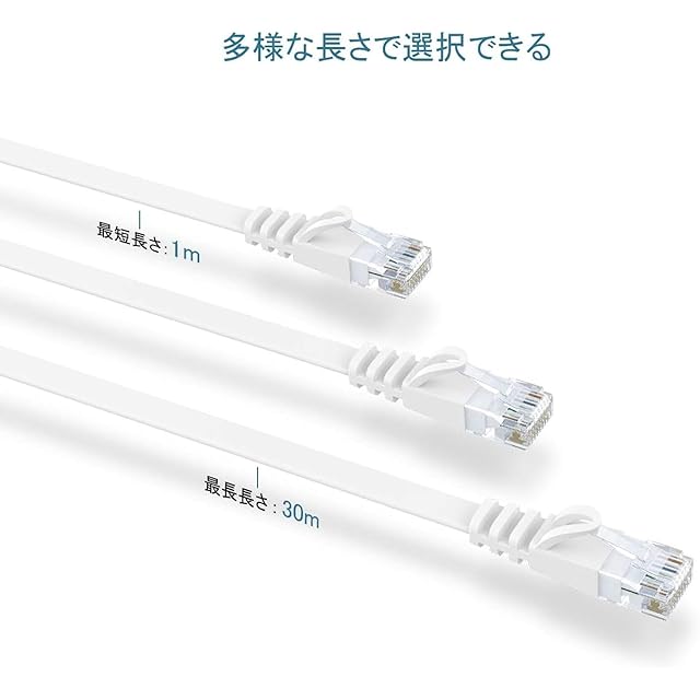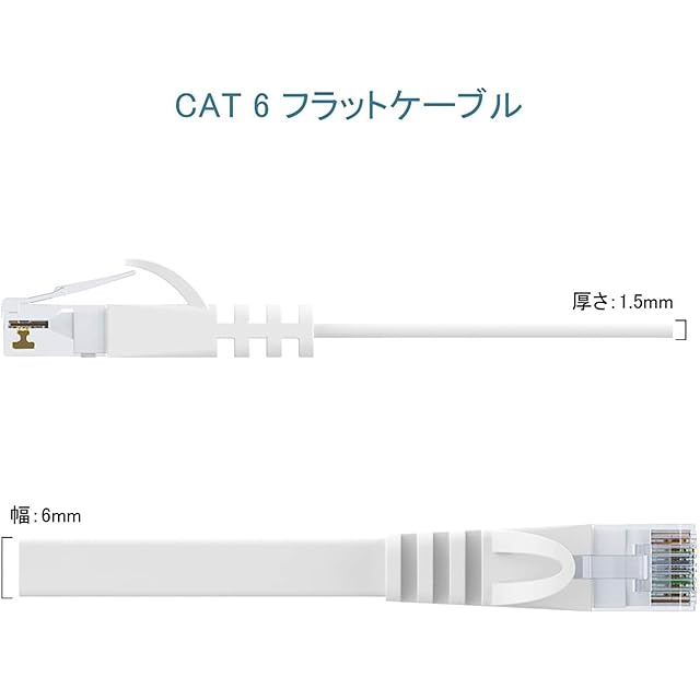 </b> <br>1000BASE-TXギガビット環境に最適なカテゴリー6ケーブル</b> <br> <br>ケーブル線体構成:<br> <br>·ワイヤ構造:100%銅線、4対8芯シールドケーブル<br> <br>·プロテクタ:爪折れ防止プロテクタ<br> <br>·ジャケット素材:エコPVC/LSZH(国際RoHS準拠)<br> <br>·ワイヤゲージ:32AWG<br> <br>·コネクタ:RJ-45(両端コネクタ付)<br> <br>·色:ホワイト<br> <br>商品仕様:<br> <br>·規格:Cat6準拠(10BASE-T/100BASE- TX/1000BASE-T/1000BASE-TX対応)<br> <br>·伝送速度:1Gbps<br> <br>·伝送帯域:250MHz<br> <br>·ケーブル長さ:3m<br> <br>·交換性:既存のCat 5/Cat 5eLANケーブルとの互換性があり<br> <br> </b> <br>RJ45デバイスに対応</b> <br> <br>対応デバイス(RJ45): <br> <br>モデム<br> <br>Xbox<br> <br>PS4/PS3<br> <br>ルーター<br> <br>ビデオ監視<br> <br>プリンター<br> <br>ノートパソコン<br> <br>TV(LANポートがあり)<br> <br>デスクトップコンピュータ<br> <br>......<br> <br>超薄いフラットデザインのLANケーブル、取り付けやすく、スペース節約します。取り付けるとき、回るところなども中の線材を壊さないように簡単に配線工事できます。<br> <br>適用場所:<br> <br>絨毯下<br> <br>カーペットの下<br> <br>細い隙間ところ<br> <br>オフィスのコーナーなど<br> <br> </b> <br>厚さ約1.5mmのスーパーフラットCAT6Lanケーブル</b> <br> <br>ギガビット環境に最適なcat6準拠ケーブル<br> <br>伝送速度は1000Mbps(1Gbps)、カテゴリー5eより2.5倍の伝送帯域を持って、高速伝送、通信安定、1.0Gbps/250MHzに達っします。10GBASE-T、100BASE-T、1000BASE-TX、100BASE-TX、10BASE-Tに適用します。<br> <br>商品仕様:<br> <br>規格:Cat6準拠(10BASE-T/100BASE-TX/1000BASE-T/1000BASE-TX対応)<br> <br>伝送速度:1Gbps<br> <br>伝送帯域:250MHz<br> <br>素材:平たく柔らかい<br> <br>ケーブル厚さ:1.5mm(誤差:±0.1mm)<br> <br>ケーブル幅:6mm(誤差:±0.1mm)<br> <br>ケーブルタイプ:フラットケーブル<br> <br> <br>·多様な長さにより適応なのを選択できます。<br> <br>長さ:3m/5m/10m/15m/20m/30m<br> <br>·工事がやすく進むために、長さより設置用のピンを用意いたしました。<br> <br>·長さよりコードクリップ(ピン)付き状況一覧:<br> <br>3m/5m:クリップなし<br> <br>10m/15m:クリップ10pcs<br> <br>20m/30m:クリップ20pcs<br>