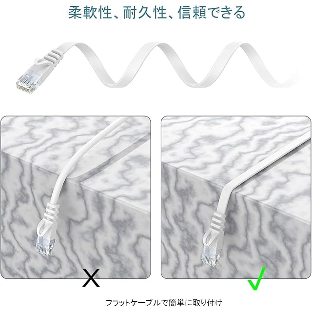 [フラットタイプで簡単に配線]:薄さ1.5mmの平ケーブルで、薄いデザイン柔らかく、オフィス、自宅、ホテル、ネットカフェなどには最適、カーペットの下、ドアの隙間などの配線工事が心配なく取り回します。