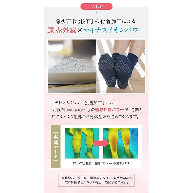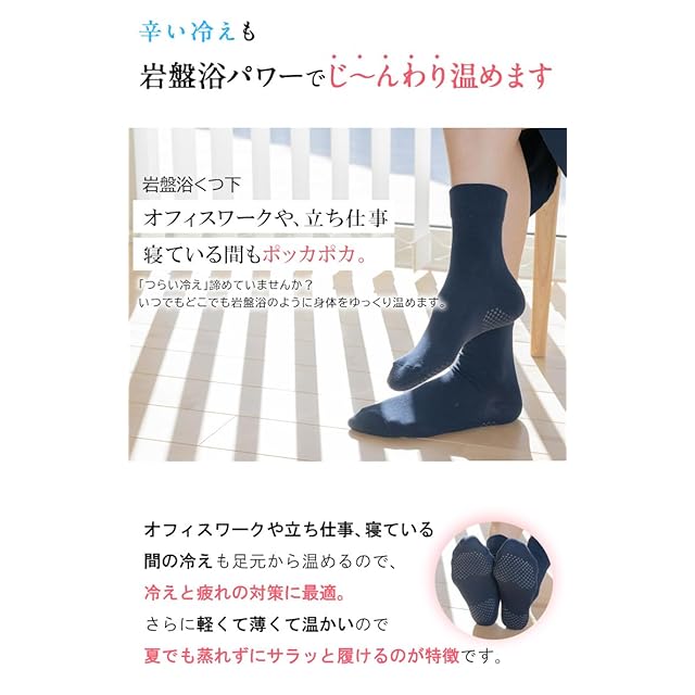 *綿100%素材の靴下。 *適度にフィット体に優しい。 岩盤浴・工房の靴下は足底部分に張り付け加工してあります。日本製の男女兼用です。ずれない、ゆったり、たっぷりロング。夏は冷房対策、冬は保温対策のための肌着です。薄手であることが特徴です。温活や冷え取りにもおすすめです。むくみ、疲労回復にも利用されています。人気の理由は、玉川温泉の岩盤浴で利用されている北投石の原石を練り込み加工していることです。その北投石の秘密は、岩盤浴効果のある遠赤外線が放出されており、また森林浴と同じレベルのマイナスイオンが放出されていることです。おやすみの時に利用されることをおすすめします。 もちろん日中の着用も出来ます。