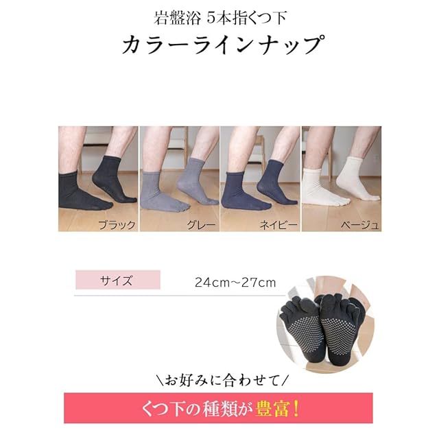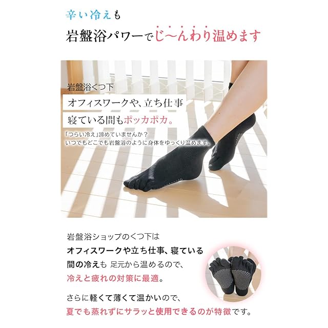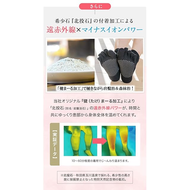 【コンセプト】 秋田県玉川温泉の岩盤浴に使われている北投石を練り込み加工した靴下製品。冷え性対策、寒さ対策、温活、冷房対策などにもお勧めです。北投石からは「遠赤外線」と「マイナスイオン」が大量に放出されており、着用するだけで岩盤浴と森林浴のような恩恵を受けることができます。