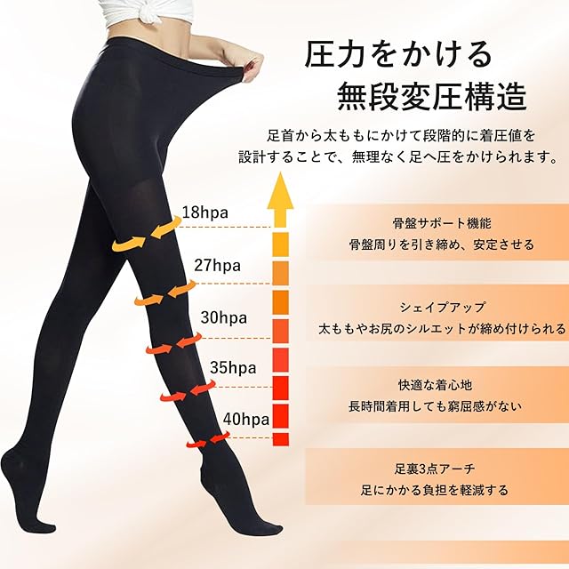 【段階圧力設計・骨盤サポート機能】一般的な着圧レギンスとは異なり、特殊な編み方を採用。足首は40hPa、太ももは18hPaと、足首から太ももにかけて段階的に圧力を設計しているため、無理なく脚全体に圧をかけることができます。日中はもちろん、就寝時の着用も可能です。また、着圧により太ももやお尻が引き締まり、履くだけで骨盤まわり・脚全体・ヒップラインを同時にサポートします。