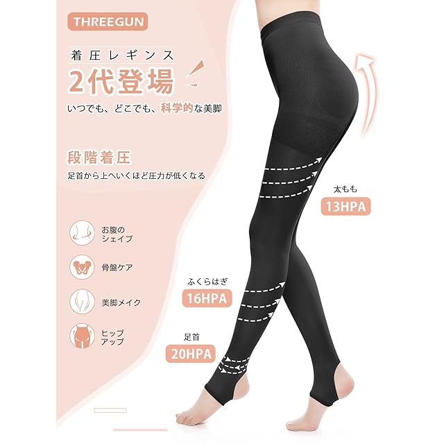 【THREEGUN着圧トレンカ】お客様の試着感想を合わせて、外形、材質を改良して、「お出かけタイプ」の着圧トレンカが誕生。圧力ゾーンをお腹/お尻、太もも、ふくらはぎ、足首部位に分けて、テーピング原理を応用して下半身をしっかりサポートします。