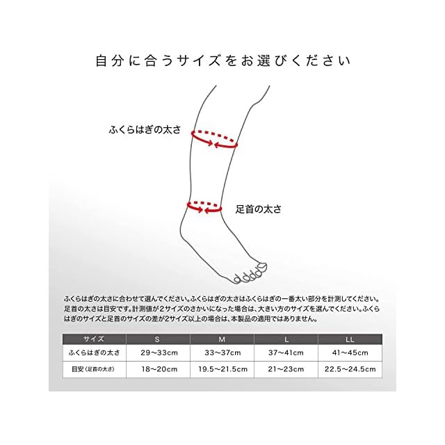 サイズの選び方:ふくらはぎの一番太い部分と足首の太さを計測ください