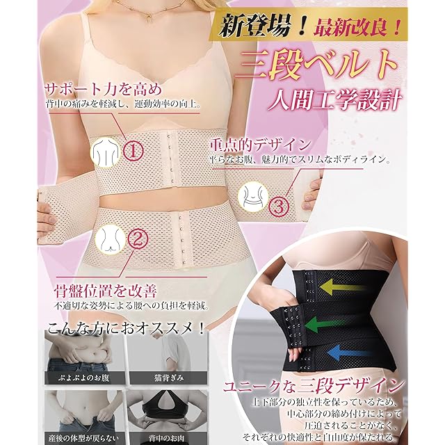 【三段ベルト・人間工学設計】 コルセットは、ウエストのさまざまな部分をより科学的にサポートするユニークな三段デザインが特徴です。コルセットが腰の上・中・下の各部位に圧力を加えることができるため、姿勢不良による腰の疲労や不快感を軽減し、姿勢を改善することができて、長時間の立ちや座りでも快適に過ごせるよう、体の負担を効果的に分散します。また、上下の部分がそれぞれの独立性を保っているため、中心部分の締め付けによって圧迫されることがなく、それぞれの快適性と自由度が保たれます。