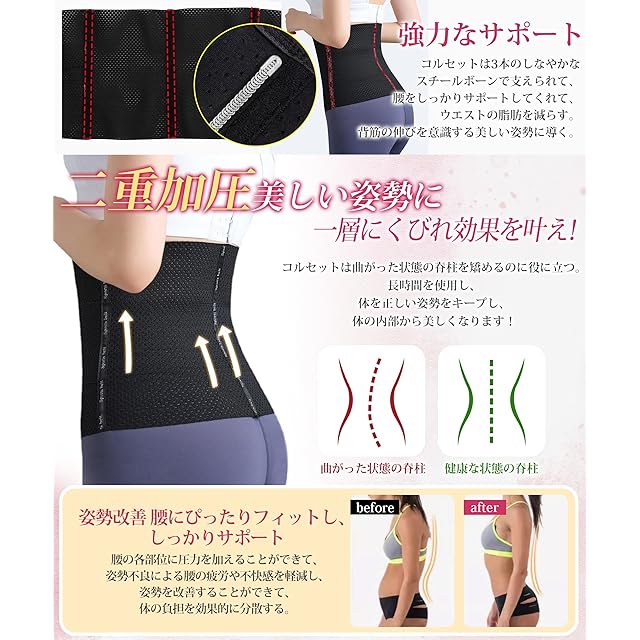 【二重加圧・美しい姿勢に】 ニ重加圧のウエストニッパーはしっかりとしたサポートを提供するだけでなく、一層にくびれ効果を叶え、長時間の着用でも快適さをします。コルセットは3本のしなやかなスチールボーンで支えられて、腰をしっかりサポートしてくれて、ウエストの脂肪を減らします。コルセットは姿勢を正し、曲がった状態の脊柱を矯めるのに役立ちます。コルセットを長く使用し、体を正しい姿勢をキープすることが役立ち、体の内部から美しくなります!
