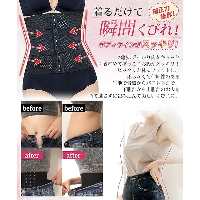 【通気性抜群・様々な場合に適用】 日常生活、ダイエット、産後、スポーツなどの場合に幅広くお使いいただけるメッシュコルセットです。通気性抜群なので、夏に履いても蒸れないし、逆流や漏れを効果的に防ぎ、さまざまなスポーツを効果的に行うことができます。ウエストニッパーはいつでも一日中着用でき、完璧なウエストラインとヒップラインを簡単に作り出せます。ドレスや洋服などを着たときに、ボディラインを美しく見せてくれます。シェイプアップ効果も抜群なコルセットです。
