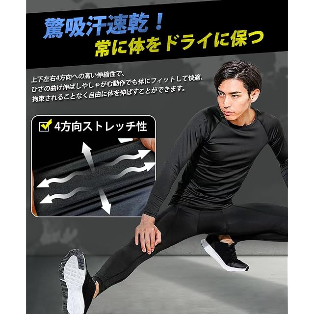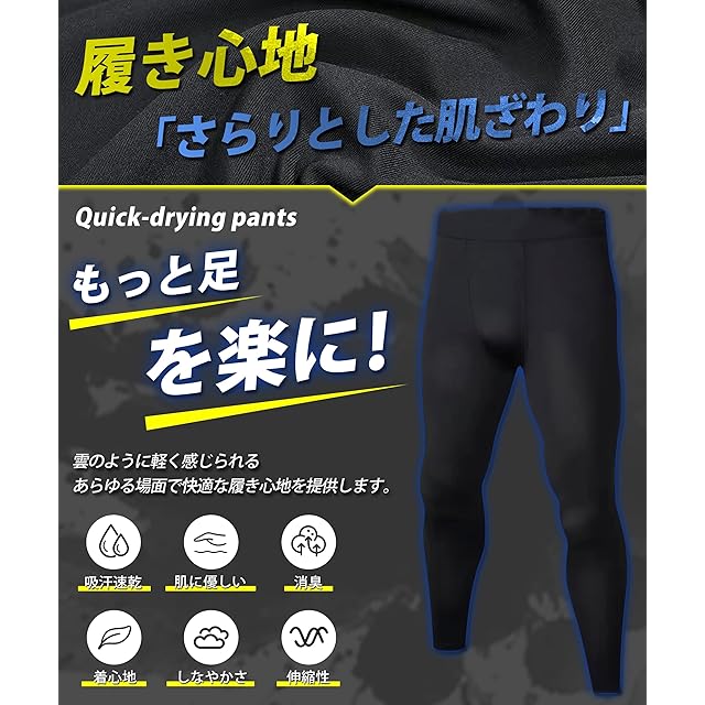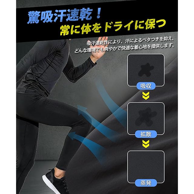 【驚吸汗速乾!常に体をドライに保つ】 このコンプレッションタイツは、通気性に優れた独自の繊維構造により空気循環を効果的に促進し、激しい運動や長時間の作業後でも体表面から湿気を素早く逃がし、臭いを素早く除去して肌をドライで快適に保つ。吸汗速乾性により、汗によるベタつきを抑え、どんな環境でも爽やかで快適な着心地を提供します。