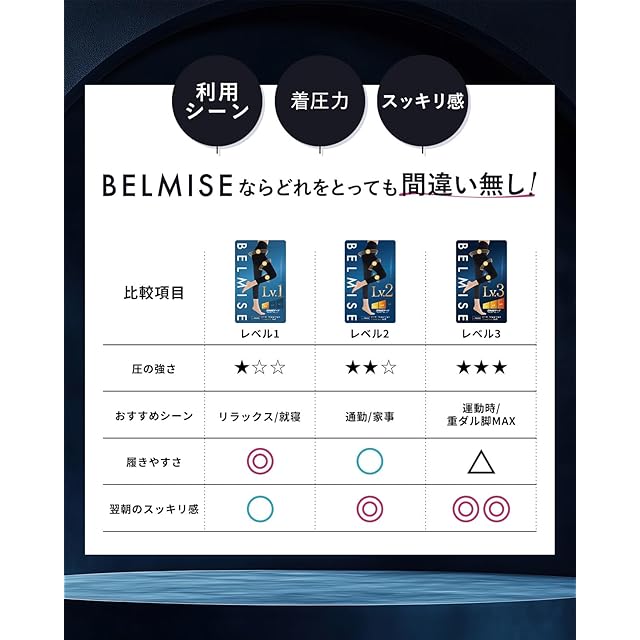 着圧レギンス の新常識は、 ベルミス から。 3段階の選べる履き心地。 美しく、そして気持ちよく。 すべては、あなたに“ちょうどいい” 着圧レギンス のために。