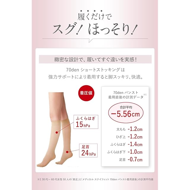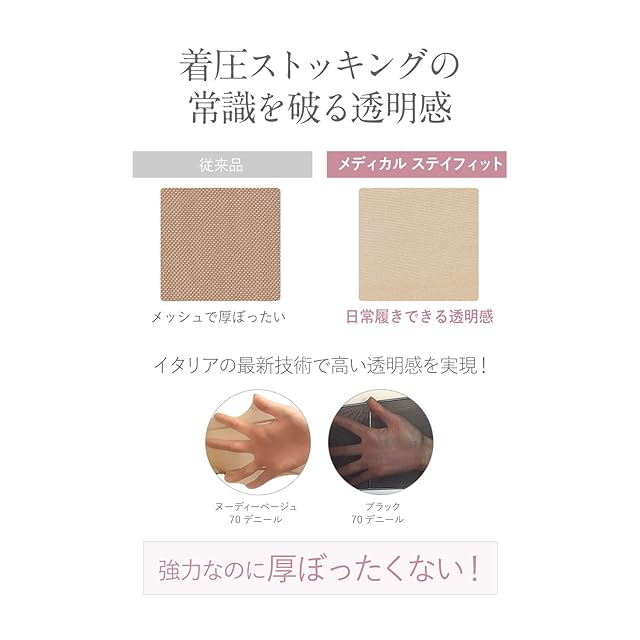 商品名:着圧 弾性 ストッキング ほっそり美脚 メディカル ステイフィット 着圧ひざ丈 ショート ストッキング 70デニール 22-25cm ヌーディーベージュ イタリア製 Medical-Stay Fit 透明感 素肌感 レディース 靴下 細みえ 美脚 履くだけ (02134)