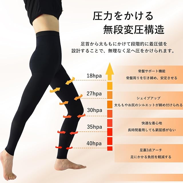 【段階圧力設計・骨盤サポート機能】一般的な着圧レギンスとは異なり、特殊な編み方を採用。足首は40hPa、太ももは18hPaと、足首から太ももにかけて段階的に圧力を設計しているため、無理なく脚全体に圧をかけることができます。日中はもちろん、就寝時の着用も可能です。また、着圧により太ももやお尻が引き締まり、履くだけで骨盤まわり・脚全体・ヒップラインを同時にサポートします。