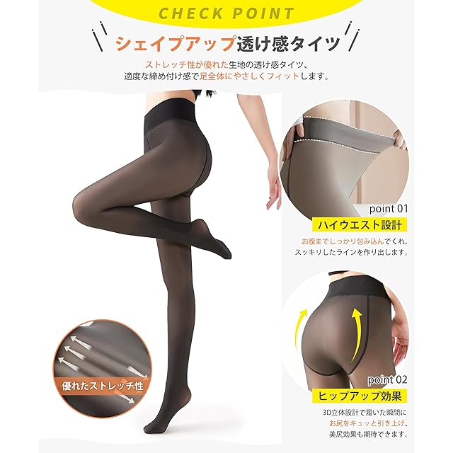 【着圧タイツ・立体美尻美脚効果】ストレッチ性に優れた生地の透け感タイツ、体にぴったりフィットし着脱しやすい。程よい着圧がある裏起毛タイツ、足全体を引き締め、視覚効果で足のラインをスッキリ見せます。ウエスト部分にゴムが付いており、締め付け感が丁度いいと感じた着圧タイツ。お尻を引き上げて支えてくれる立体構造の着圧タイツ、脚長効果も期待できます。