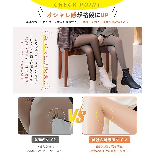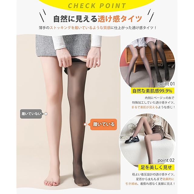 【透け感タイツ・自然な肌色見え】表面から見ると普通のタイツのようですが、内側にベージュの生地が特殊加工され、うっすらと肌の色が見えるような感じさせるフェイクタイツ。厚みがあるのに至近距離でも厚見えしない素肌感の裏起毛タイツ。つま先部分が起毛が付いていないので、普通のタイツと同じぐらい厚みで靴を履いても窮屈感がない。抗菌消臭加工が施されていた透け感タイツ、細菌の繁殖とニオイの発生を防ぎます。