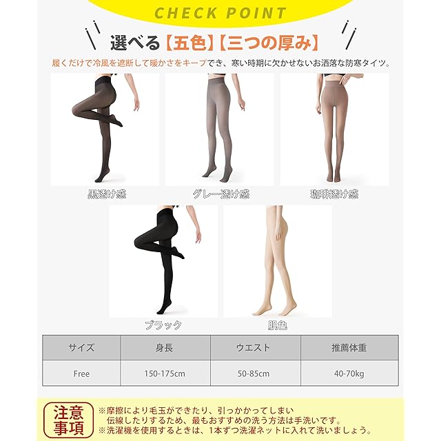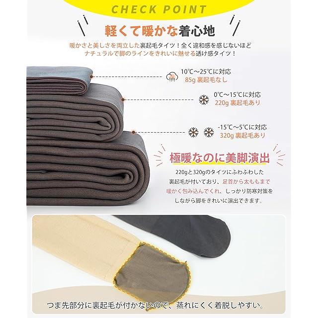 【お洒落なタイツ・着こなしやすい】ニットのワンピース、スカート、ショートパンなどと重ねる万能な透け感タイツ。秋冬のおしゃれなコーデに合わせやすく、一枚持っておくと便利な裏起毛タイツ。伝線しにくく、破れにくく丈夫な縫製に仕上がった透け感タイツ。85g薄手のタイツ(10℃~25℃に対応)、220g裏起毛タイツ(0℃~15℃に対応)、320g裏起毛タイツ(-15℃~5℃に対応)、一年中快適に過ごせます。