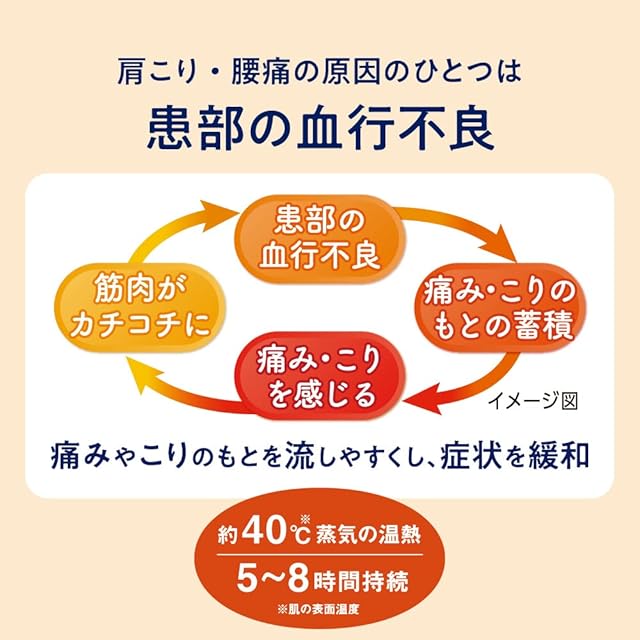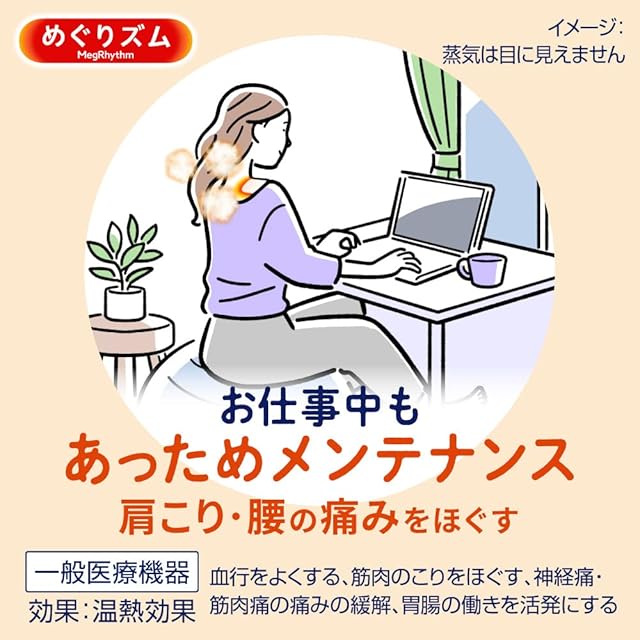 蒸気を含んだやわらかい温熱で、じんわり深く温めて患部の血のめぐりをよくし、コリや疲れ、痛みをほっとやわらげます。