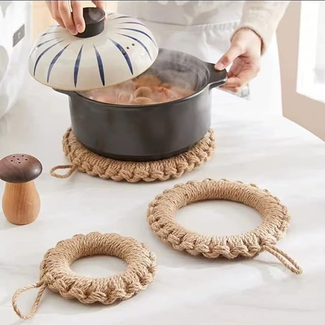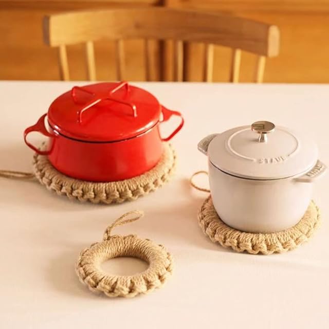 【鍋敷き】亜麻草で編まれた鍋敷きは、藁よりも柔らかな手触りでテーブルなど傷つけず軽くて丈夫です。天然素材の温もり感が料理やテーブルの雰囲気を盛り立てます。このポットスタンドは滑り止め付きで、再使用可能で、耐久性もあります。