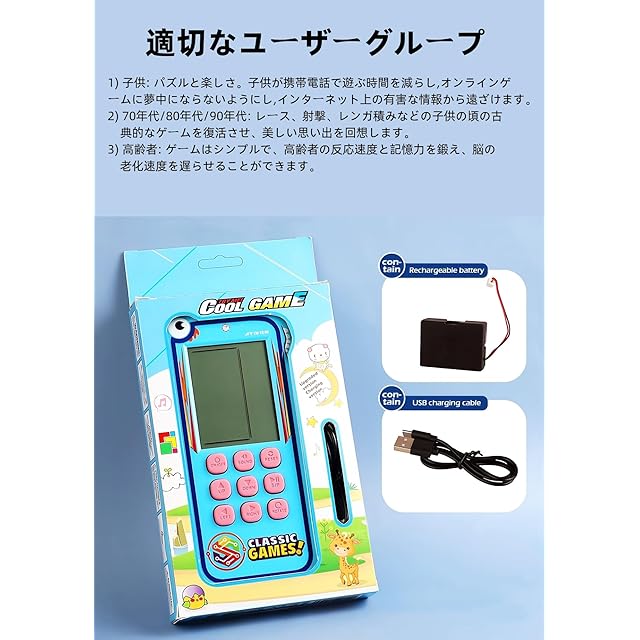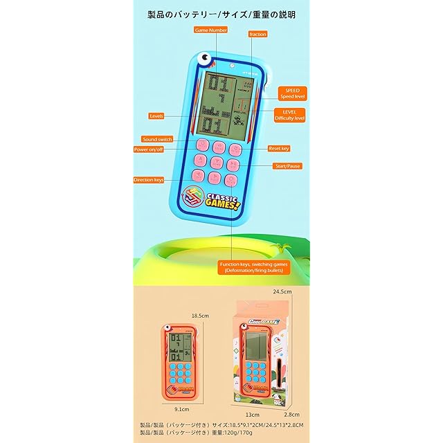 製品の説明: <br>ゲームリストとガイド: <br>01.クラシックブロックゲーム:左/右キーで方向をコントロール、回転キーで変形。 <br>02-08.その他のブリックゲーム:左/右キーで方向をコントロール、回転キーで変形。 <br>09.タンクバトル:上/下/左/右キーで方向をコントロール、回転キーで弾丸を発射。 <br>10.レーシングゲーム:左/右キーで方向をコントロール、回転キーで加速。 <br>11.ピンボール:左/右キーで方向をコントロール、回転キーでボールの移動速度を加速。 <br>12.シューティング:左/右キーで方向をコントロール、回転キーで弾丸を発射。 <br>13.障害物ピンボール:左/右キーで方向をコントロール、回転キーでボールの移動速度を加速。 <br>14-15.フィルシューティング: 左/右キーで方向を制御し、回転キーで弾丸を発射します。 <br>16-23.さまざまなリバースブロックゲーム: 左/右キーで方向を制御し、回転キーで変形します。 <br> <br>キーの説明 <br>1.オン/オフ: オン/オフキーを押して、ゲームのオン/オフを切り替えます。 <br>2. 回転: 開始する前に回転キーを押してゲームを選択すると、選択したゲームでアクションが実行されます。 <br>3. サウンド: サウンドキーを繰り返し押して、サウンドをオンまたはオフにします。 <br>4. S/P (開始/一時停止): S/P キーを繰り返し押して、選択したゲームを開始または一時停止します。 <br>5.リセット: リセットを押して、ユニットシステム全体をリセットします。 <br>6. UP/DOWN: 選択したゲームを開始する前に、UP/DOWN キーを押してパターンを選択します。UP/DOWN キーを押して、選択したゲームで上下方向を制御します。 <br>7. LEFT/RIGHT: 選択したゲームを開始する前に、LEFT/RIGHT キーを押してレベル (左) と速度 (右) を選択します。UP/DOWN キーを押して、選択したゲームで左/右方向を制御します。
