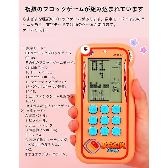 商品名:TAQY かわいいブロックゲームコンソール 2500以上のレベル 電子ゲーム レンガ/レーシング/タンク レトロポケットゲームコンソール 屋内/屋外/旅行用 ハンドヘルドゲームデバイス 充電式 子供用ギフト パズルおもちゃ (オレンジ)