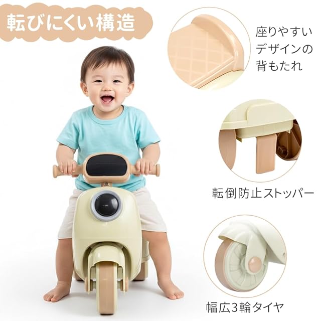 ✅幅広の3輪タイヤで転倒しにくく、低めの背もたれで小さなお子さまも安心。