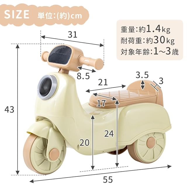 【商品詳細】サイズ:(約)高さ43×幅31×奥行55cm、重量:(約)1.4kg、耐荷重:(約)30kg、対象年齢:1~3歳