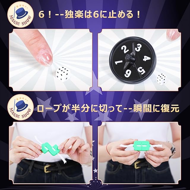 【マジック12種類セット】 12種類のマジックグッズが含まれたセットです。マジックリンク、予言独楽、切れないロープ、マジック帽子などのマジックグッズはとてもおもしろいです。子供たちは、独創的なトリックを楽しみながら、創造力を刺激し、手先を器用に使う力を育むことができます。