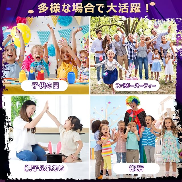 【多様なシーンで大活躍】このマジックセットを持っている子供たちは、友達や家族と一緒にマジックショーをすることができます。誰もが驚くようなトリックを披露することで、周りから注目を集めることもできます。また、誕生日パーティーや集まりなどの特別なイベントでは、マジックを披露することで、より盛り上がりを演出することができます。マジックセットは、様々な場面で活躍する楽しみな遊び道具です。