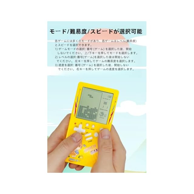 モード/難易度/スピードが選択可能。各ゲームには多くのモードがあり、各ゲームはレベル(難易度)とスピードを選択できます。 1) ゲームモードの選択: 番号 (ゲーム) を選択した後、開始しないでください。 上/下キーを押してモードを選択します。 2) レベルの選択:番号(ゲーム)を選択した後は開始しないでください。 左キーを押してゲームの難易度を選択します。 3) 速度を選択: 番号 (ゲーム) を選択した後、開始しないでください。 右キーを押してゲームの速度を選択します。