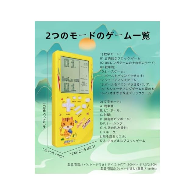製品説明: <br>ゲーム一覧と操作方法 <br>01.クラシックブロックゲーム:LEFT/RIGHTキー制御方向、ROTATEキーで変形します。 <br>02-08.その他のブロックゲーム:LEF/RIGHTキー制御方向、ROTATEキーで変形。 <br>09.戦車戦:上/下/左/右キー制御方向、回転キーで弾丸を発射します。 <br>10.レーシングゲーム: 左/右キー制御方向、回転キーで加速します。 <br>11.ピンバル: 左/右キー制御方向、回転してボールの動きの速度を上げます。 <br>12.射撃:LEFT/RIGHTキー制御方向、ROTATEキー発射弾。 <br>13.障害物ピンボール: 左/右キー制御方向、回転してボールの移動速度を上げます。 <br>14-15.フィルシューティング:LEFT/RIGHTキー制御方向、ROTATEキーで弾丸を発射します。 <br>16-23.さまざまなリバースブロックゲーム:LEFT / RIGHTキー制御方向、ROTATEキーで変形します。 <br> <br>重要な指示 <br>1.ON/OFF : ON/OFF キーを押してゲームをオンまたはオフにします。 <br>2. ROTATE: 開始する前に ROTATE キーを押してゲームを選択すると、選択したゲームでアクションが実行されます。 <br>3. サウンド:サウンドキーを繰り返し押して、サウンドをオフまたはオンにします。 <br>4. S/P (開始/一時停止): S/P キーを繰り返し押して、選択したゲームを開始または一時停止します。 <br>5.RESET: RESETを押してユニットシステム全体をリセットします。 <br>6. 上/下: 選択したゲームを開始する前に、上/下キーを押して、選択したゲームのパターンを選択します。上/下キーを押して、選択したゲームの上下方向を制御します。 <br>7. 左/右: 選択したゲームを開始する前に、左/右キーを押して、選択したゲームのレベル (左) と速度 (右) を選択します。上/下キーを押して、選択したゲームの左/右方向を制御します。