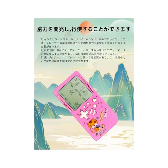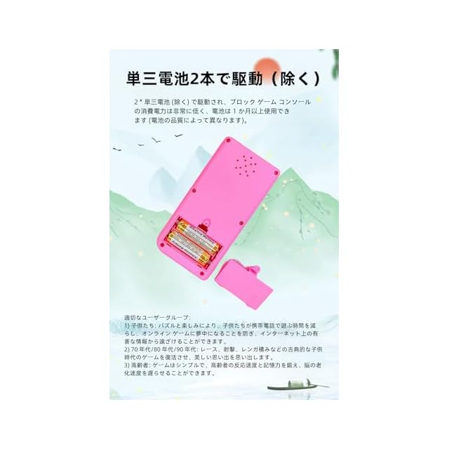 単三電池2本で駆動。2 * 単三電池 (除く) で駆動され、ブロック ゲーム コンソールの消費電力は非常に低く、電池は 1 か月以上使用できます (電池の品質によって異なります)。製品/製品(パッケージ付き)サイズ:14*7*1.8CM/14.5*7.3*2.3CM 製品/製品(パッケージ含む) 重量:71g/86g