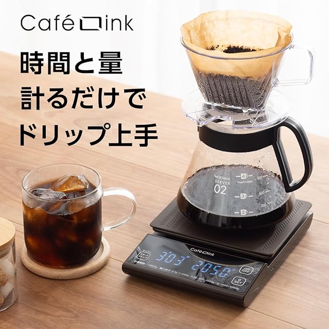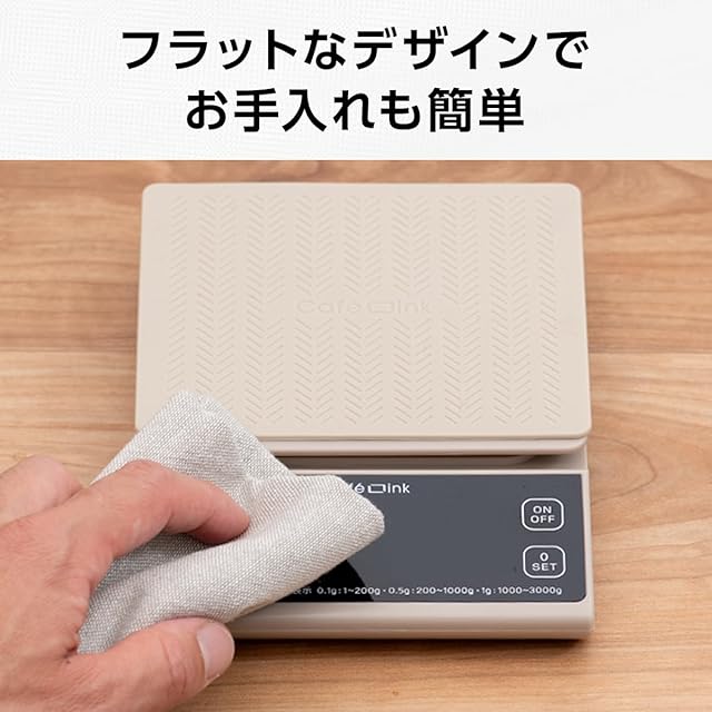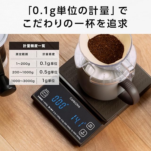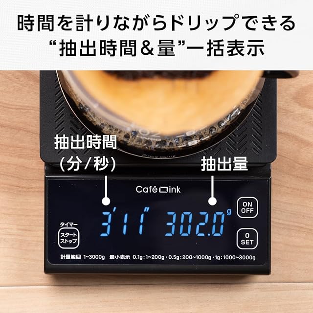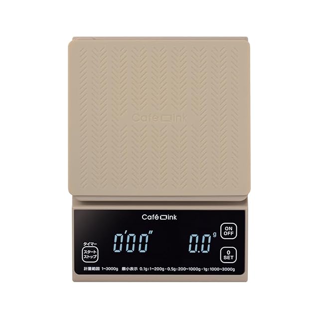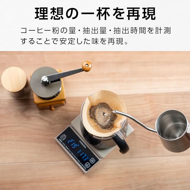 最大計量3kg 0.1g単位で計れる「微量モード」搭載のデジタルスケール。ドリップ時間を計れるカウントアップタイマー機能。容器内の重さだけを計れる「0表示機能」。暗い場所でも見やすい液晶タッチパネル。着脱可能なシリコーンゴムマット付き。
