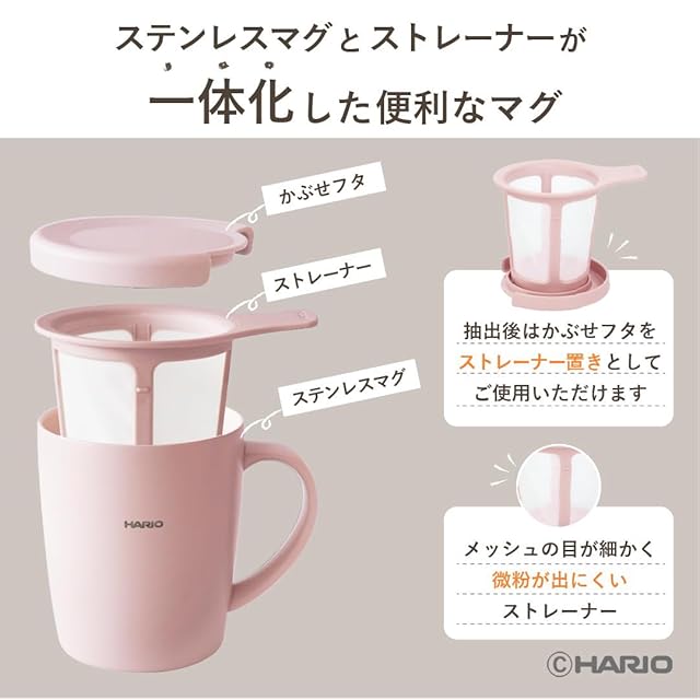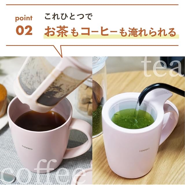 マグ1つでお茶もコーヒーも。 ストレーナーに茶葉/コーヒー粉を入れてお湯を注いでフタをして待つだけ。 簡単に1人分が淹れられます。