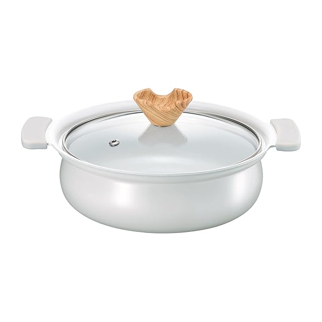 素材:表面加工/内面:セラミックコーティング、外面:焼付塗装、材質/本体:アルミニウム合金、はり底:18-0ステンレス(底の厚さ:2.3mm)、取手カバー:シリコーン樹脂、フタ:全面物理強化ガラス、つまみ:フェノール樹脂(木目調シリコーンコーティング)
