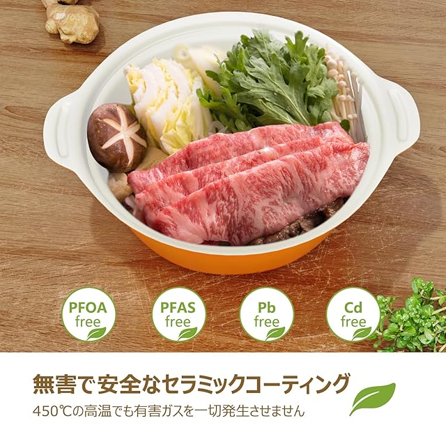 材質:本体/アルミニウム、はり底·ガラス蓋金属部/ステンレス鋼、セラミックコーティング(耐熱温度260度)、ガラス蓋/強化ガラス(安全と健康の保障)