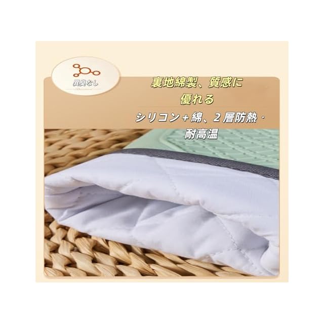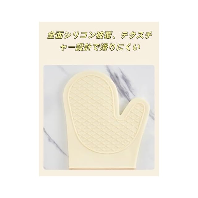 【滑り止め機能と防水性を両立】ミトンと鍋敷きの表面にはシリコン製の凹凸加工が施されているため、滑りにくい特性があり、食品や調理器具が手から脱落するのを防ぎます。同時に防水性能も備えているため、熱湯や水蒸気によるやけどを効果的に防止できます。