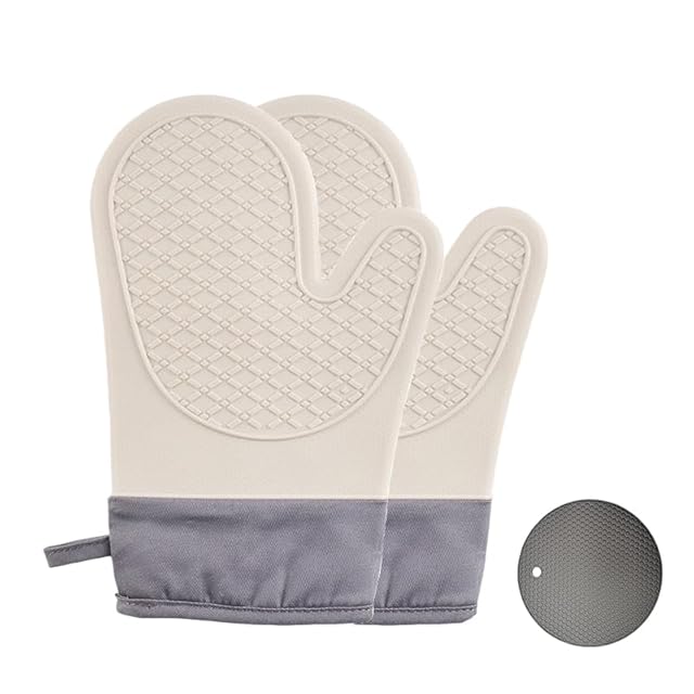 耐熱ミトン 鍋つかみ オフホワイト オーブンミトン シリコン 300℃耐熱 滑り止め 防水 シリコン製 ケーキを焼く バーベキュー用 クッキング用 鍋料理 両手セット ミトン2枚 鍋敷き1枚(グレー)