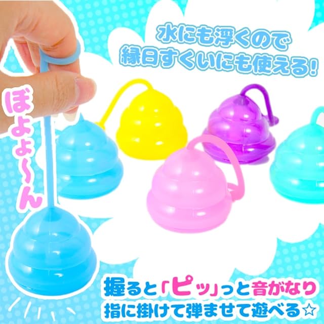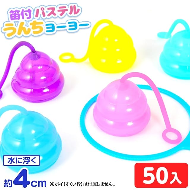 パステルカラーがきれいなうんちヨーヨーです。 握ると、「ピッ」っと音がなり、指に掛けて弾ませて遊びます。 水にも浮くので縁日すくいにも使えちゃいます☆