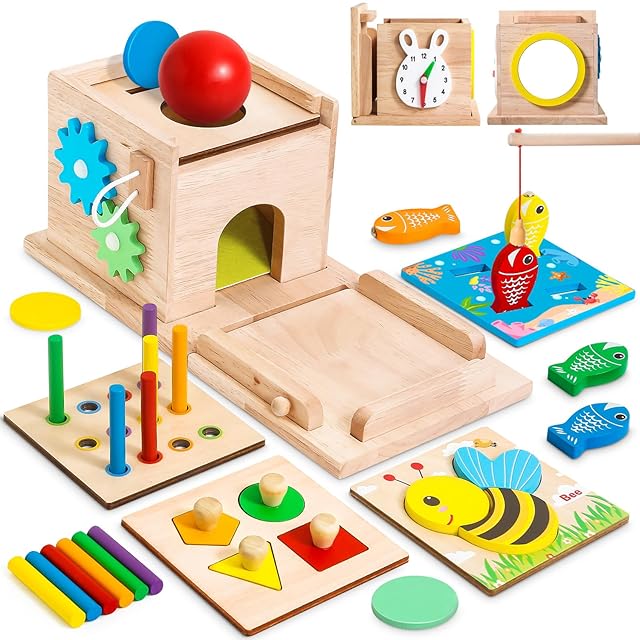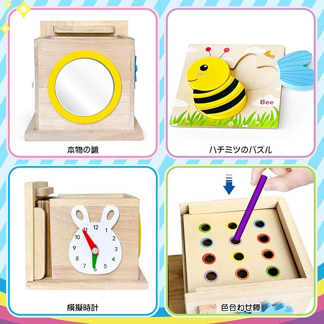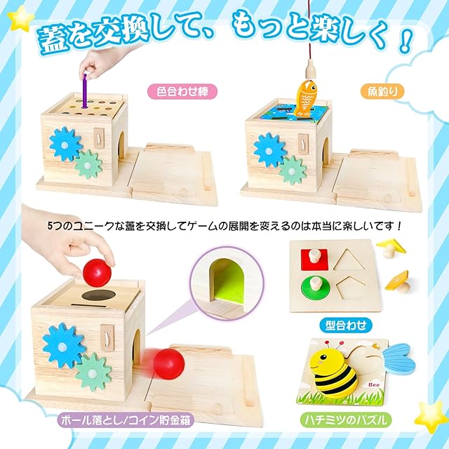 【8-in-1 木製ボックス】モンテッソーリ教育に基づいた当社のプレイキットには、形合わせと積み上げ、色合わせ棒落としゲーム、釣りゲーム、コインバンク、ボール落としゲーム、回転ギア、模擬時計、形合わせゲームなど、8つの感覚ゲームが1つのお得なセットに詰まっています。様々な年齢の幼児にお楽しみいただける素晴らしいプレイキットです。