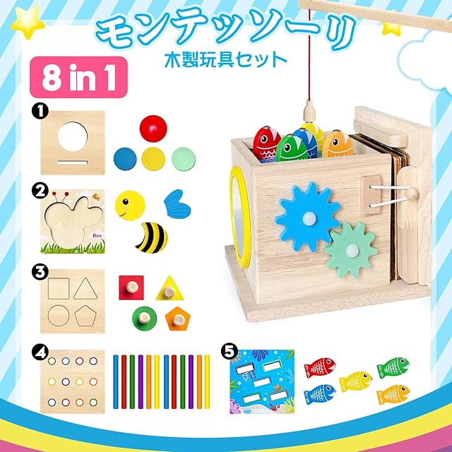 モンテッソーリ教育に基づく木製知育玩具セット。歯車回し、合わせ、色合わせ棒落としゲーム、釣りゲーム、コインバンク、ボール落としゲーム、模擬時計、形合わせゲームなど8種類の遊びで、子どもの手指の発達や論理的思考を促します。お子様の早期教育玩具として最適です。