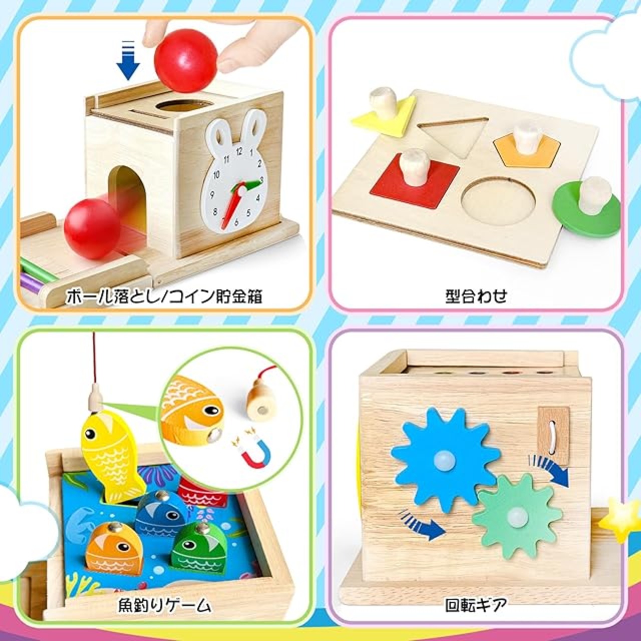 商品名:MIRAIMAX モンテッソーリ 8-in-1 木製玩具、コイン貯金箱、釣りゲーム、色と形合わせ、回転ギア、パズル、模擬時計と鏡等の機能付き - クリスマス 誕生日プレゼントとして、男の子、女の子、幼児向け早期教育セット