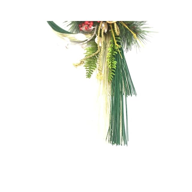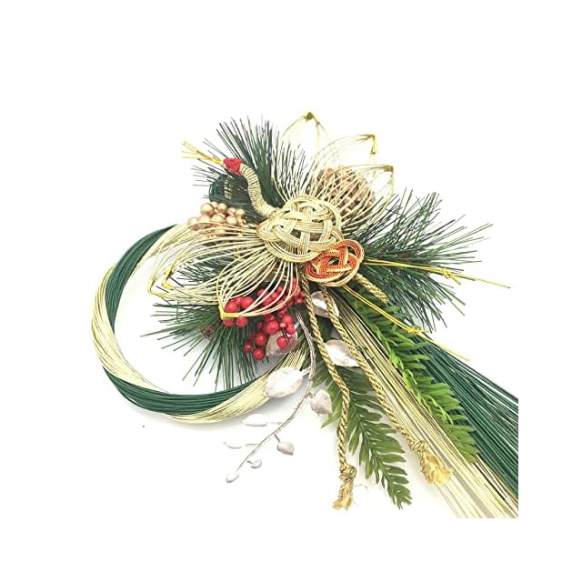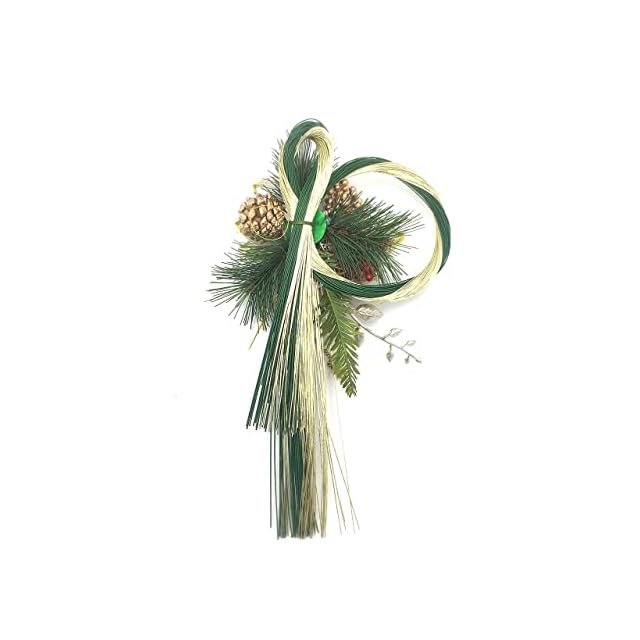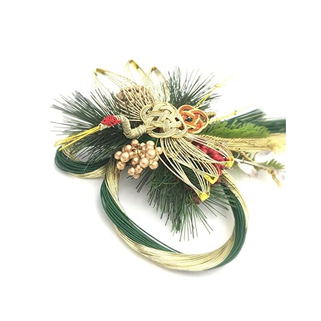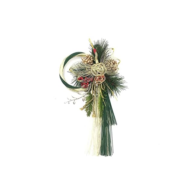 縦31cm横19cm厚み7cm<BR> 生産国:中国<BR> ■特徴■<BR> 水引を中心としたお正月飾りです。<BR> 後ろの部分にワイヤーが付いておりますので、ひっかけて飾ってください。又は、水引の部分にひかけて飾ると縦にかざれます。<BR> 緑とゴールドカラーなので上品な雰囲気のお正月飾りです。<BR> 玄関ドアや玄関の壁,お部屋に飾ってお正月をはなやかな雰囲気に演出してくれます。<BR> 水引中心としているので日差しには比較的強いのですが、日差しが強い場合は色あせが起こる場合がございます。<BR> 雨や水などに濡れてしまうとパーツが取れてしまう原因になるので避けてご使用下さい。<BR> <BR> <BR> ■ご使用する前に■<BR> 箱や袋から取り出す際にラメや粉が落ちる場合がございます。<BR> ラメや粉が落ちても問題のない場所、片付けや掃除しやすい場所であけてください。<BR> お正月飾りを取り出すと形が崩れている場合がございます。<BR> 形を手で整えてください、整える際にラメや粉が落ちます、落ちても問題ない場所、片付けや掃除しやすい場所で整えてください。<BR> 商品画像を参考に整えてください。あくまでも、参考です。<BR> <BR> 整えるとお正月飾りの表情も変わりますので、お客様の好きな表情に変えて楽しんでくださると幸いです。<BR> <BR> <BR> ■注意事項■<BR> お子様が口にしないようご注意ください。<BR> 強い衝撃を与えると破損する恐れがありますのでご注意ください。<BR> 本製品はハンドメイドのためサイズや色合に多少の個体差があります。<BR> 濡れると色落ちする場合がありますのでご注意ください。<BR> 火の側には置かないでください。<BR> ラメを使用している場合、手や周囲のものに付着したり落ちたりします。予めご了承ください。<BR> 装飾パーツは引っ張り強い力を加えると破損・脱落の恐れがあります。 自然由来のパーツを使用しています。形や大きさに不揃いや欠損している箇所があります。<BR> また種や実が落ちることがあります。予めご了承ください。 <BR>吊り下げて使用する場合、取り付け面が丈夫であること、万が一落下しても怪我をしない、または破損する物が無い場所であることを必ず確認してください。<BR> 当商品は素材同士の結合部分に針金(地巻線)を使用しております。<BR> 商品加工時には充分注意いたしておりますが、パッケージから取り出し飾り付けの際には、手や裾に当たり、ケガをすることがありますのでご注意下さい。<BR> 燃え易い素材を使用しておりますので、火気から2メートル以上離れた場所 に飾るようにして下さい。<BR> 自動車やバイクなどの車輪に引っかかるような場所に飾らないで下さい。<BR> 多湿な場所での長期保管はカビや虫の発生をまねきます。ご注意下さい。<BR>
