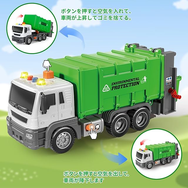 【素敵なゴミ収集車のおもちゃ】本物のゴミ収集車の造形を模倣し、ワンクリックで空気を入れて空気を放出して車両の昇降を制御し、子供たちは長い間遊んでいて飽きないです。 ふり遊びや楽しみを楽しむ子供たちにとって素晴らしいプレゼントです。それらを使って、親子の相互作用を促進できます。6歳以上の子供に適しています。