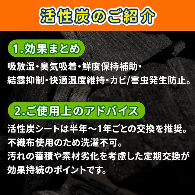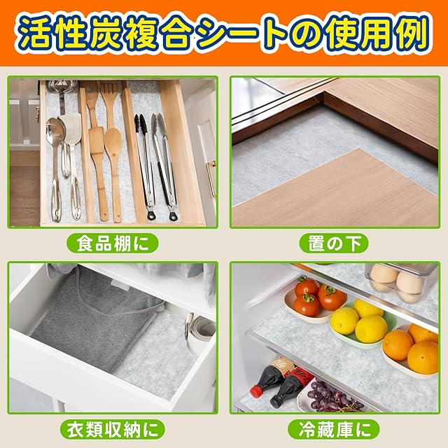 【どこでも使える多用途シート】 活性炭を使用したシートは、食品庫やシンク下など、食材が収納されている場所の消臭・防湿にもお使いいただけます。タンスの衣類や布団押入れの湿気対策にも最適です。