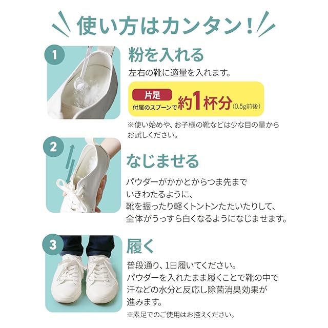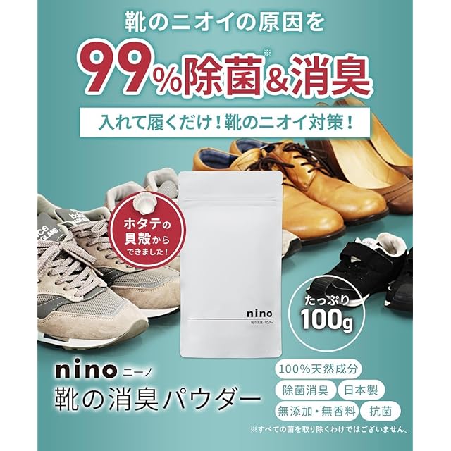 1日履いた靴、外出先で靴を脱がないといけない状況、たくさん遊んで汗をかいたお子さんの運動靴、ずっと気になっていた靴の嫌なニオイ。nino(ニーノ)靴の消臭パウダーはそんな嫌なニオイを原因から除菌・消臭してくれます。使い方はいたってシンプル!専用スプーンでパウダーを靴にいれてそのまま履くだけ!天然ホタテ貝のパウダーが強い除菌作用を発揮。そして、使い続けることで靴の中で汗などの水分とパウダーが反応し、効果が長続きします。nino(ニーノ)靴の消臭パウダーはホタテ貝殻を特殊時術により除菌消臭効果のある微細なパウダーに加工しているため、100%天然成分、無添加・無香料です。小さいお子さんやご年配の方にも、スニーカー・革靴・パンプス・ムートンブーツ・上履き・安全靴・ブーツ・レインブーツ・長靴など幅広くご家族の足元にお使いいただけます。ほかのニオイでごまかさない、nino(ニーノ)靴の消臭パウダーでしっかり消臭・スッキリお悩み解決!