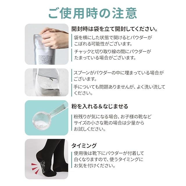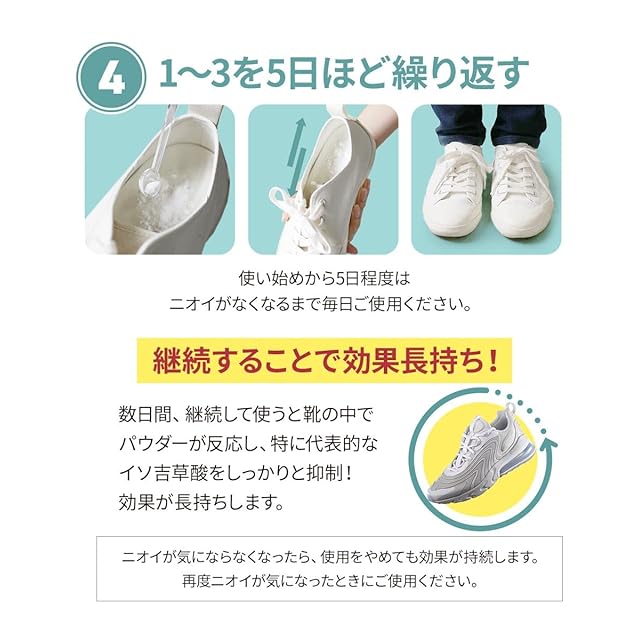 【使い方は簡単】nino(ニーノ)靴の消臭パウダーなら、靴に入れて履くだけ!入れてすぐに履いていただけます。使い始めから5日程度はニオイがなくなるまで毎日ご使用ください。継続して使用することで、靴の中で汗の水分とパウダーが反応し、効果が長続きします。