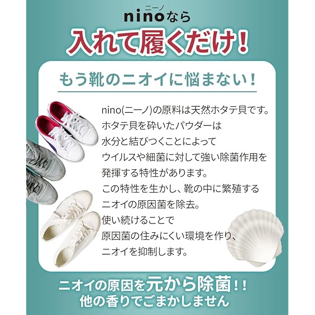 【靴のニオイに】玄関で、外出先で。その靴脱ぐのこわくないですか?nino(ニーノ)靴の消臭パウダーの原料のホタテ貝殻パウダーは、水分と結びつくと強い除菌作用を発揮し、使い続けることで原因菌の住みにくい環境を作り、ニオイを抑制します。他の香りでごまかしません。