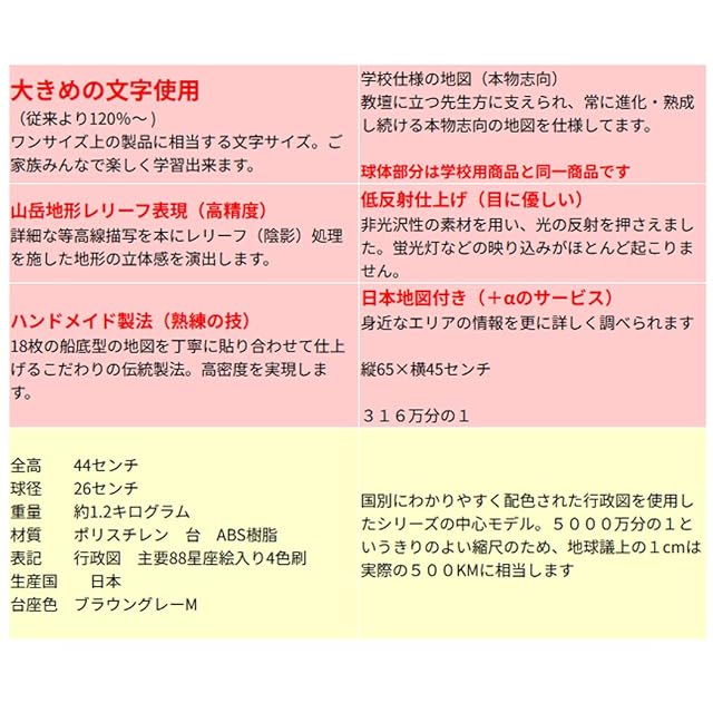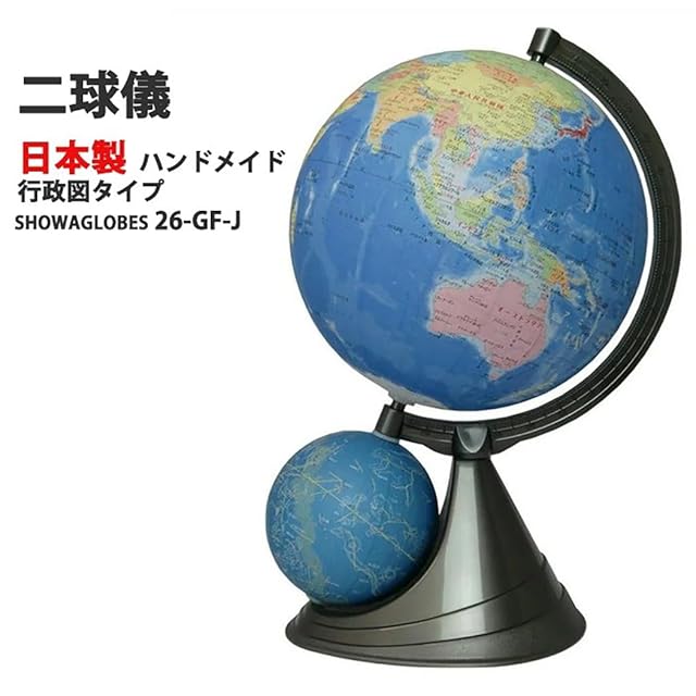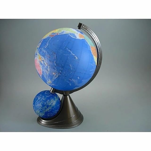 ■商品詳細:二球儀 地球儀 26cm 26-GF ■大きめの文字使用<br> (従来より120%~ )<br> ワンサイズ上の製品に相当する文字サイズ。ご家族みんなで楽しく学習出来ます。<br> ■山岳地形レリーフ表現(高精度)<br> 詳細な等高線描写を本にレリーフ(陰影)処理を施した地形の立体感を演出します。<br> ■ハンドメイド製法(熟練の技)<br> 18枚の船底型の地図を丁寧に貼り合わせて仕上げるこだわりの伝統製法。高密度を実現します。<br> ■学校仕様の地図(本物志向)<br> 教壇に立つ先生方に支えられ、常に進化・熟成し続ける本物志向の地図を仕様してます。<br> 球体部分は学校用商品と同一商品です<br> ■低反射仕上げ(目に優しい)<br> 非光沢性の素材を用い、光の反射を押さえました。蛍光灯などの映り込みがほとんど起こりません。<br> ■日本地図付き(+αのサービス)<br> 身近なエリアの情報を更に詳しく調べられます<br> 縦65×横45センチ<br> 316万分の1<br> <br> ■商品詳細<br> 全高 44センチ<br> 球径 26センチ<br> 重量 約1.2キログラム<br> 材質 ポリスチレン 台 ABS樹脂<br> 表記 行政図 主要88星座絵入り4色刷<br> 生産国 日本<br> 台座色 ブラウングレーM<br> <br> ■国別にわかりやすく配色された行政図を使用したシリーズの中心モデル。5000万分の1というきりのよい縮尺のため、地球議上の1cmは実際の500KMに相当します<br>