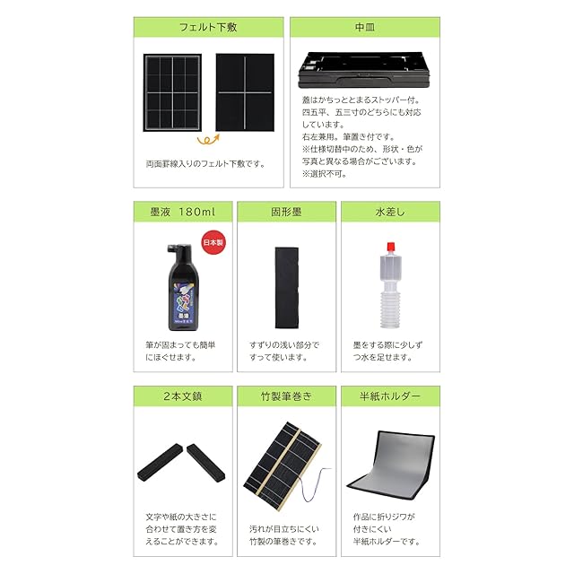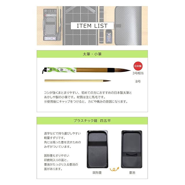 ・太筆(日本製) ・小筆 ・硯(超軽量プラスチック両面 四五平) ・墨 ・墨液 ・文鎮 ・罫線入り下敷き ・筆巻 ・水差し ・中皿 ・半紙ホルダー ・ショルダーベルト
